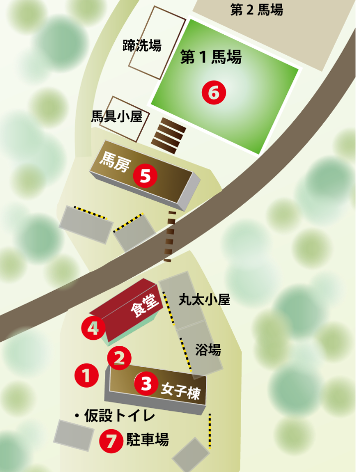 牧場施設は老朽化等によりこれまでのような宿泊ができる状態ではありません。牧場で宿泊をする場合には、各自で準備いただいた上で、場内でのテント泊や女子棟内・馬房内での寝袋泊をしていただく形になります。(下記会場マップもご覧ください。)ハードではありますが、牧場を満喫し、また牧場留学・キャンプの頃にはできなかった貴重な体験ができると受け止めていただきたいと考えています。
